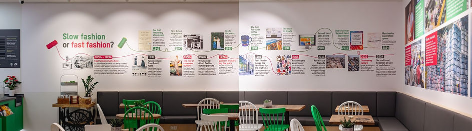 From the bright and bold messaging throughout, to local artists bringing people's stories to life in the changing rooms, to a timeline in the cafe that weaves together Manchester's links to the fast fashion industry - to name just a few.